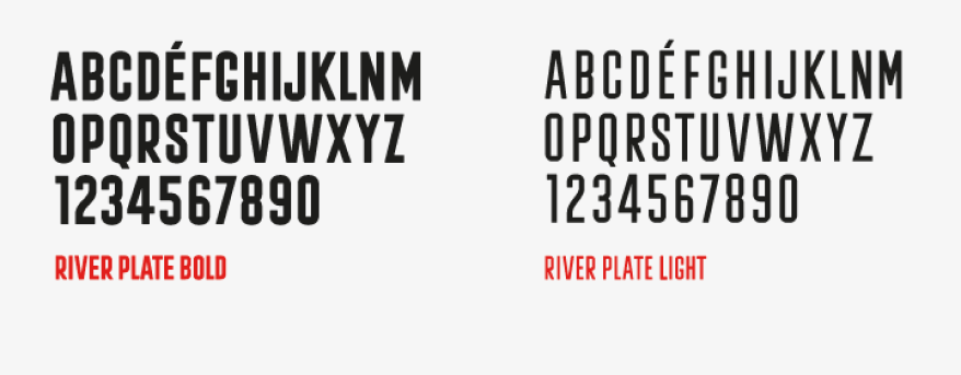 La tipografía de River Plate fue diseñada en forma exclusiva para esta identidad, siguiendo las características formales de los rasgos distintivos del monograma emblemático CARP.