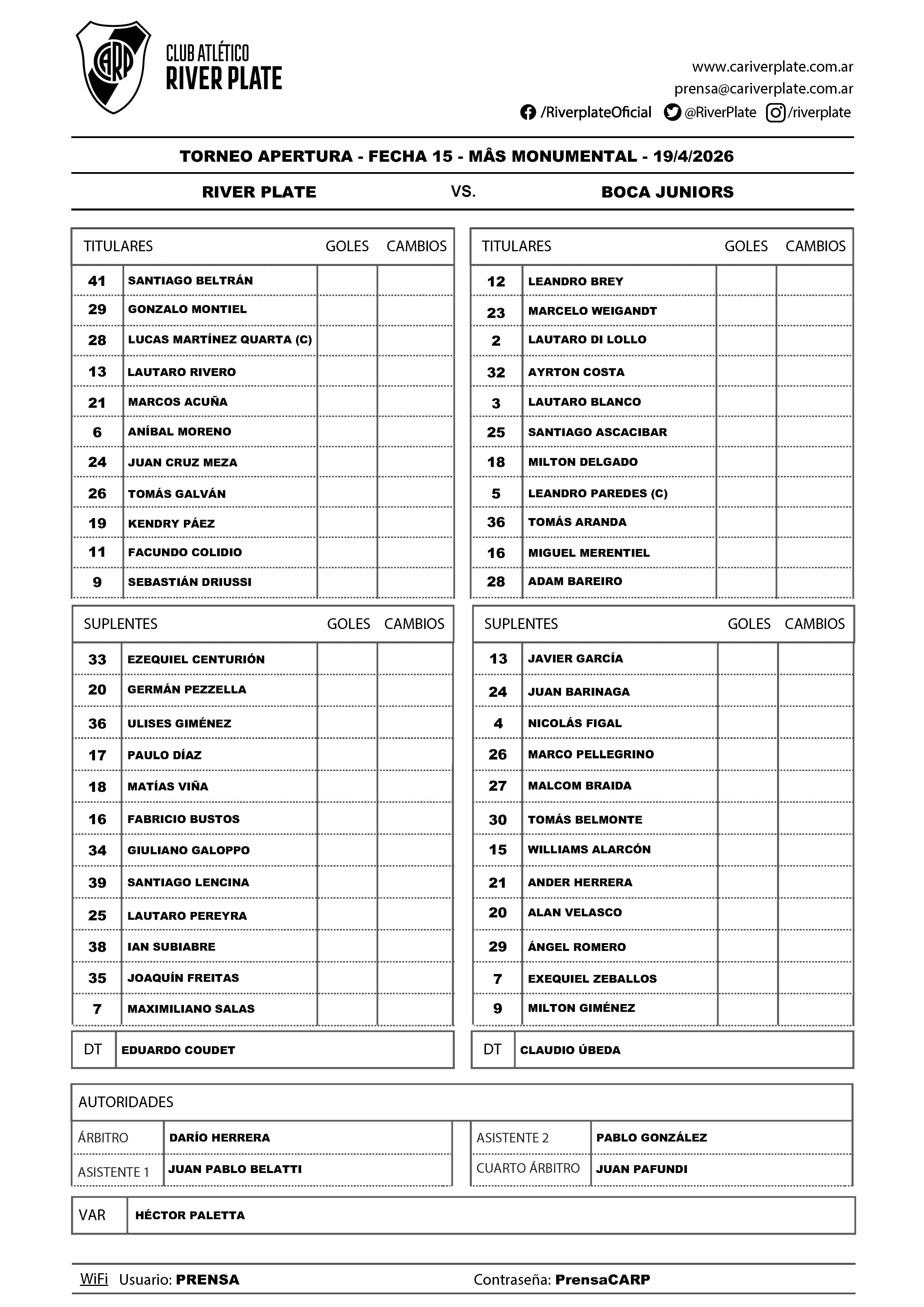 Formaciones - River vs. Boca Juniors