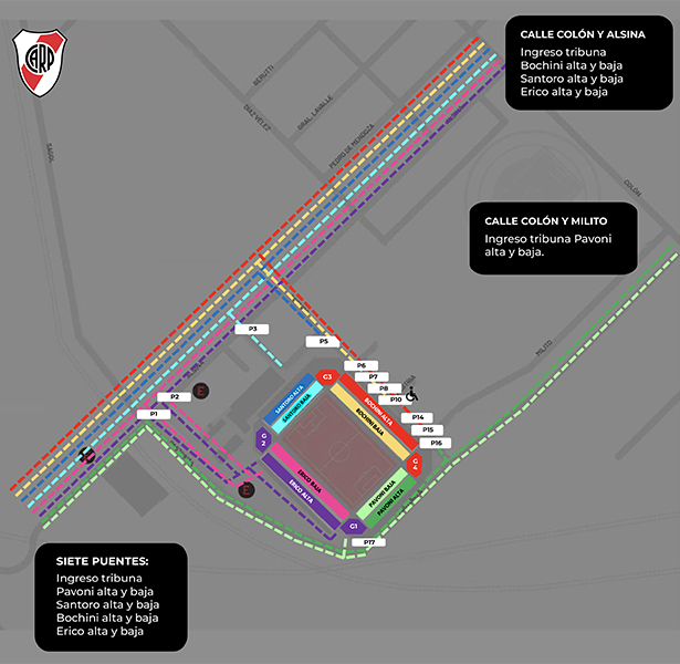 Los hinchas que tengan ubicación en las tribunas Bochini (alta y baja), Santoro (alta y baja) y Erico podrán acceder al estadio desde la esquina de Colón y Alsina o desde Siete Puentes. Quienes asistan a la tribuna Pavoni (alta y baja) podrán hacerlo desde Colón y Milito o desde Siete Puentes.