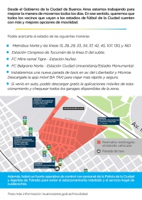 En una acción de la Secretaría de Transporte del Gobierno de la Ciudad de Buenos Aires, quienes se acerquen al Estadio en bicicleta podrán dejarlas en un sector exclusivo, de manera gratuita, ubicado en Figueroa Alcorta y Basabilvaso.