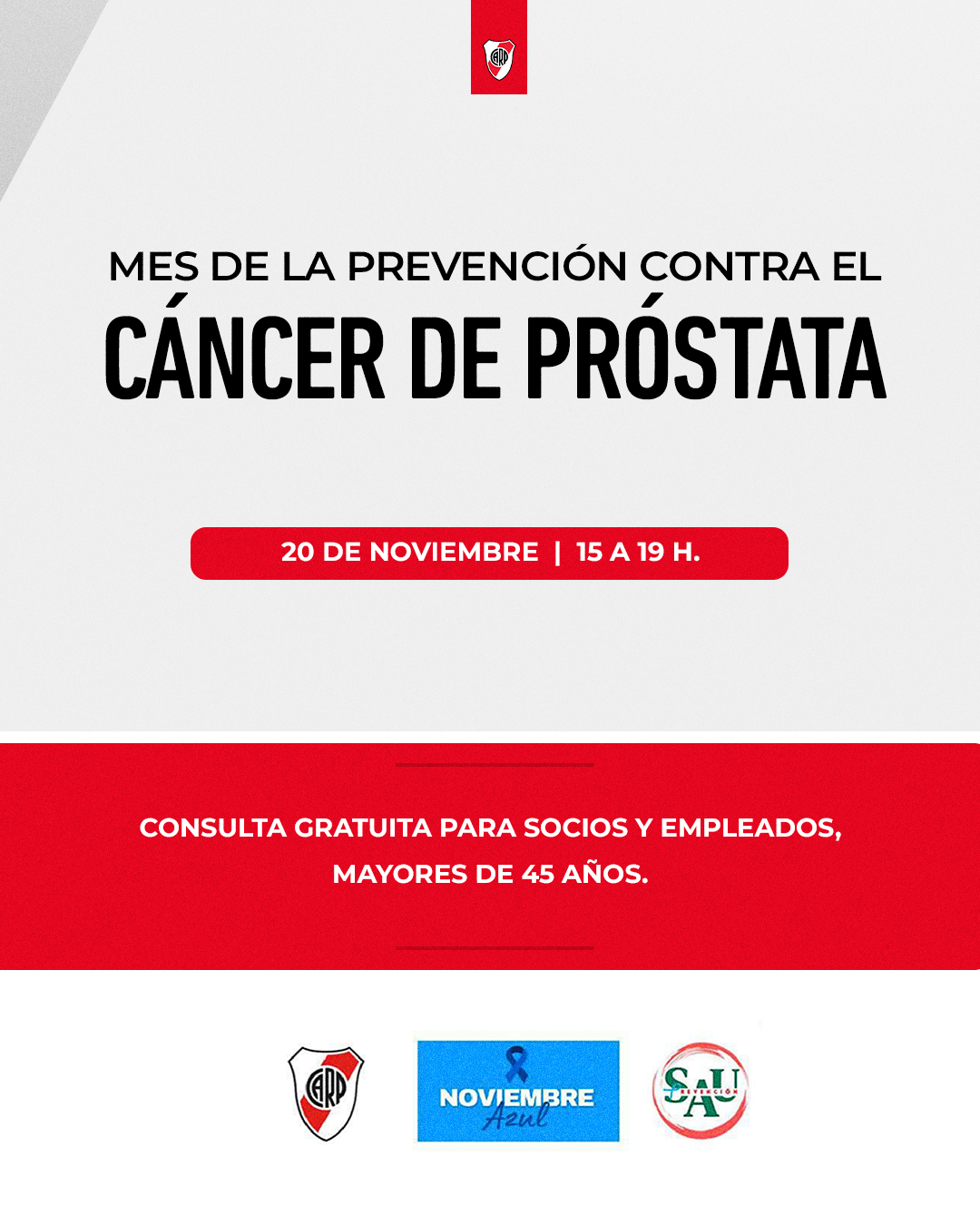 En el marco de los programas de prevención y detección temprana de enfermedades que viene realizando el Departamento Médico de River, esta nueva iniciativa tendrá lugar el jueves 20 de noviembre en las oficinas del Departamento Médico (ubicada en el anillo interno), de 15 a 19.