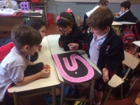 Los alumnos de primer grado A, junto a su docente, Jesica Cáceres, siguen avanzando en sus aprendizajes numéricos a través del juego. En esta oportunidad, trabajaron en grupos con numeración y escalas numéricas hasta el 70, resolviendo desafíos con el juego de la oca.